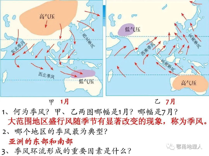 季风环流成因是由于海陆热力差异和气压带风带季节移动。季风环流主要分布在亚洲东部,东南部和南部,包括热带气候(南亚季风)和亚热带季风和温带季风(东亚季风)。在南亚地区由于季风环流产生的洋流季节性变化也是高考常查的高频考点。