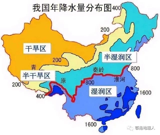 通过对多年平均降水量的分析发现,“秦岭—淮河”线基本与我国800毫米等降水量线基本重合,而800毫米年等降水量线是湿润区和半湿润区的分界指标。下图为四大干湿地区划分标准和分布图。