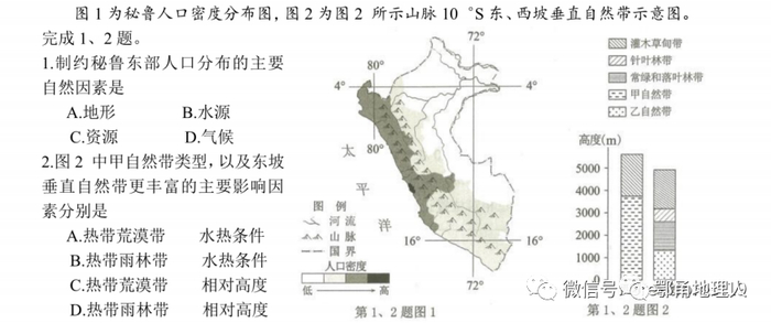 【试题解析】本题组以南美洲秘鲁人口分布图和安第斯山脉东西坡自然带分布图为区域背景,考核学生综合思维、区域认知。第1小题:人口分布主导的自然因素是气候、地形、水源等。安第斯山脉西侧水源少人口密度高,排除B;安第斯山脉东西两侧地形均为平原(沿海平原和亚马孙平原)排除A。秘鲁由于安第斯山脉阻挡,再加上西海岸秘鲁寒流影响导致该纬度西部地区形成非地带性气候—热带沙漠气候,东部地区为热带雨林气候(属于亚马孙平原局部)。本组题关键点是要明确南纬10度在南美洲秘鲁西海岸不是地带性热带雨林,而是由于秘鲁寒流形成了非地带性热带沙漠气候。故答案为:1.D 2.A。