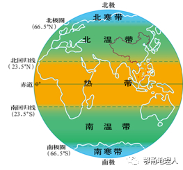 温度带中的亚热带和亚寒带,从上图根本找不到。因为从热带到温带,亚热带只是两者之间的过渡地带;同理从温带到寒带中,亚寒带就是过渡带。