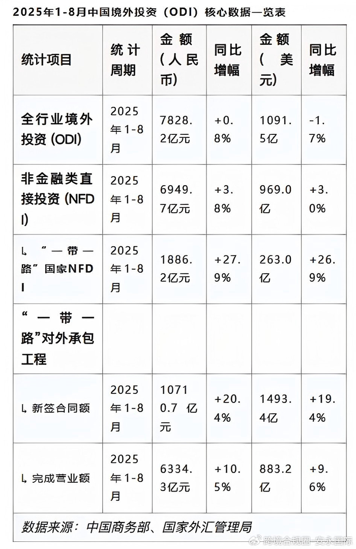 根据中国商务部及外汇局新统计数据,2025年1-8月中国全行业境外投资(ODI)活动在复杂外部环境下展现韧性,整体保持平稳态势,同时对共建“一带一路”国家的投资与合作表现尤为强劲。