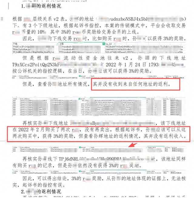 控方声称存在“下线交易,上线抽成3%”的返利机制。曾杰律师对此进行了彻底的“存在性验证”:本案鉴定意见中,还另外核实了部分(40名)可实名查证的投资者,他们的交易地址,交易金额,都作为控方的指控依据,进而指控R币整体的投资情况。而曾杰律师将这40名投资者的投资地址关联此前检方提交的原始数据,发现有21名存在邀请下线的行为。
