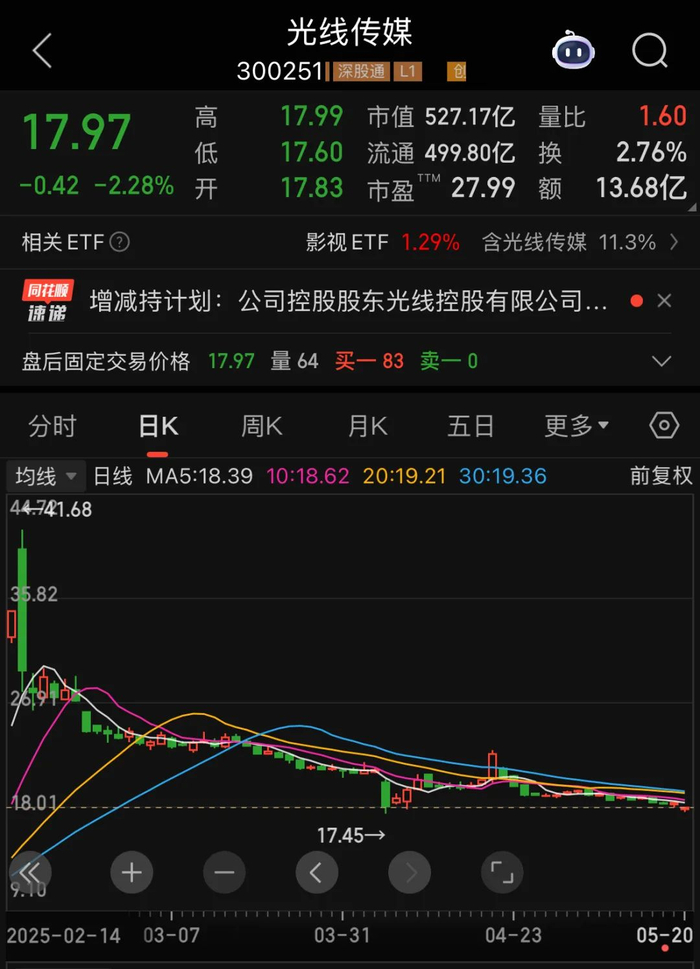 5月20日,光线传媒跌2.28%,收于17.97元/股,市值527.17亿元。