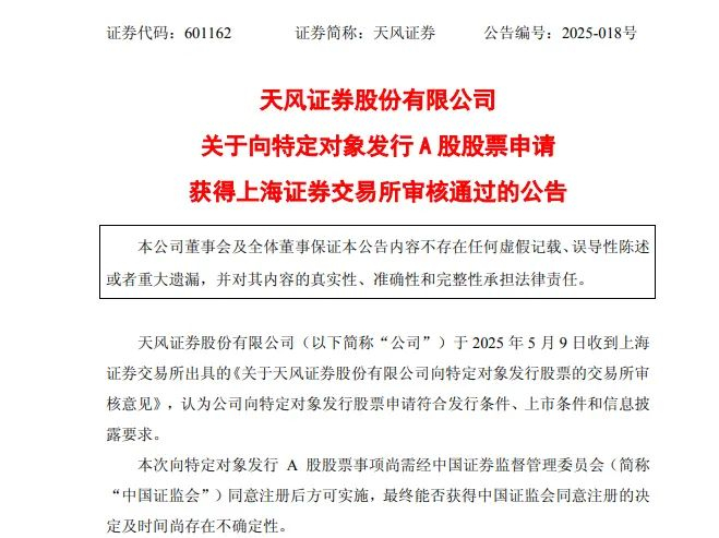 5月9日,天风证券收到上交所的审核意见,认为公司向特定对象发行股票申请符合发行条件、上市条件和信息披露要求。5月16日,南京证券发布公告称,公司向特定对象发行A股股票申请已获得上交所受理。