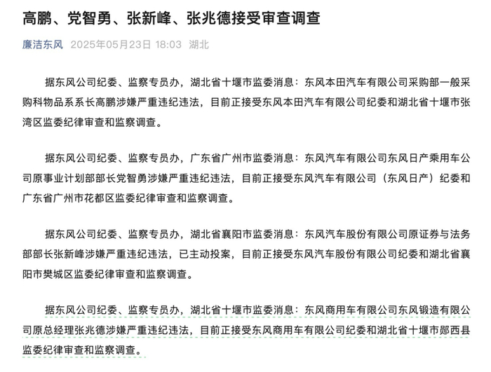 此次,东风本田、东风日产、东风商用车等合资子公司的高鹏、党智勇、张新峰、张兆德4人落马,涵盖采购、计划、证券法务等关键岗位。