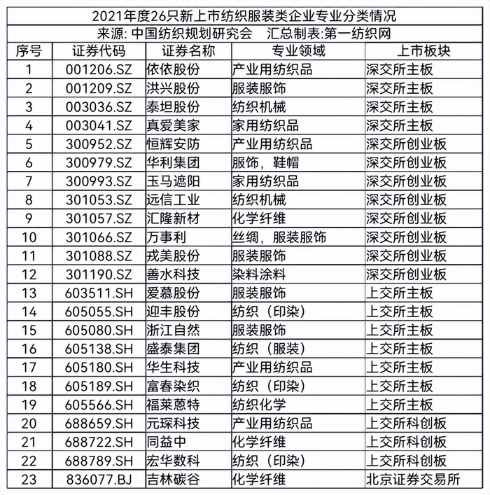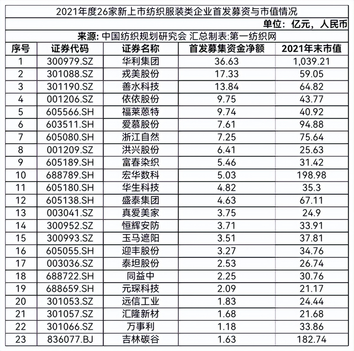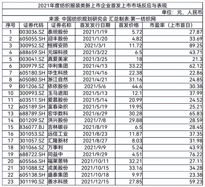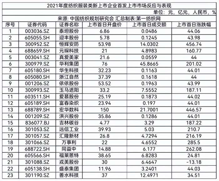 中国纺织规划研究会强调,2021年度纺织服装类新上市23家企业在首发上市日的市场反应和整体表现是非常不错的。从相关资料统计情况看,上市首日市场平均估值(市盈率)39.13,中位数31.98。从二级市场直接反映出来的估值看,科技含量高应用广泛或附加价值高的产业用纺织品类企业普遍被市场追捧;上市首日开盘股价相比发行价涨幅表现优异,(增幅)平均值达82.07%;上市首日成交总额144.90亿元;上市首日平均涨幅126.78%,有9家首日涨幅超过100%,恒辉安防、宏华数科和万事利分别以456.74%、446.57%和285.50%的涨幅位列前三。(中国纺织规划研究会)