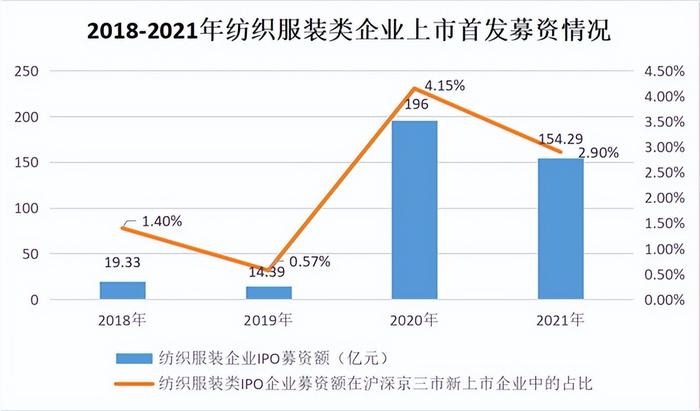 据中国纺织规划研究会统计,2021全年共有23家纺织服装类企业在沪深京三市成功上市,是三十年来纺织服装类企业上市数量最多、数量增速最大的一年。全年纺织服装类新上市企业数比上年增长了27.78%,纺织服装类新上市企业在沪深京三市新上市企业总数占比为4.39%,比上年度降低了0.16个百分点;2021年度纺织服装类企业在沪深京三市IPO首发募资额达154.29亿元,占A股全年IPO募资金额的2.90%(比上年度占比4.15%减少了1.25个百分点)。
