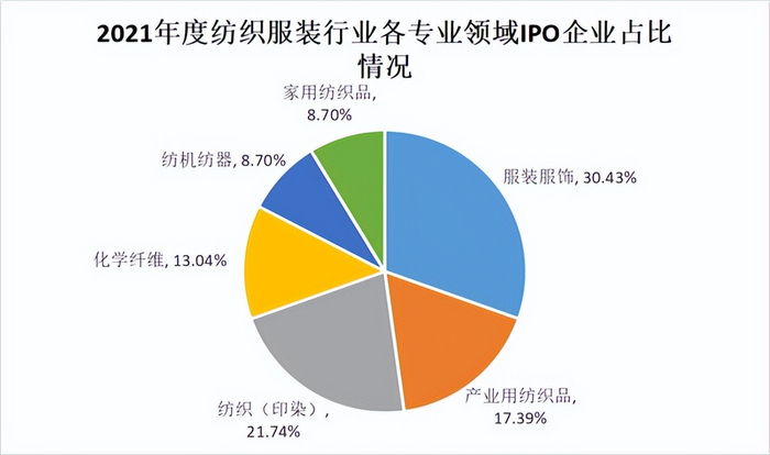从细分专业领域看,服装服饰类新上市企业最多,占比30.43%;纺织(印染)、产业用纺织品、化纤产业,占比分别为21.74%、17.39%、13.04%,家用纺织品和纺机纺器占比均为8.70%。