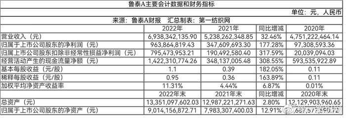 全球高档色织面料生产商和国际一线品牌衬衫制造商——鲁泰纺织股份有限公司(以下简称“鲁泰A”)日前发布2022年年报,报告期内,公司实现营业收入69.38亿元,同比增长32.5%;实现归属于母公司的净利润9.64亿元,同比增长177.3%。