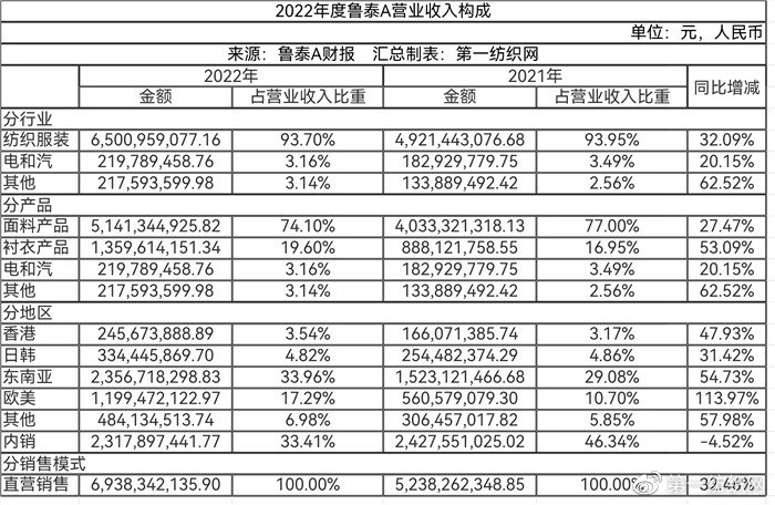 2022年度,鲁泰A围绕满足客户需求和市场需要,扩大海外生产基地规模,海外新建项目按计划有序推进,同时,公司持续加强国内优质客户的合作力度,提升市场占有率,公司与海澜集团签署战略合作协议,与京东京造达成生产合作,重点开发优质女装客户。不断丰富产品品类,加快针织、功能性面料的市场推广。同时,以通讯、建筑、航空、金融等职业服装为切入点,顺应消费新趋势,通过新时尚、新媒体、新零售等引领大众市场消费升级,做精“拳头产品”、稳定领军地位,分层次、有重点地加强内外贸一体化发展。