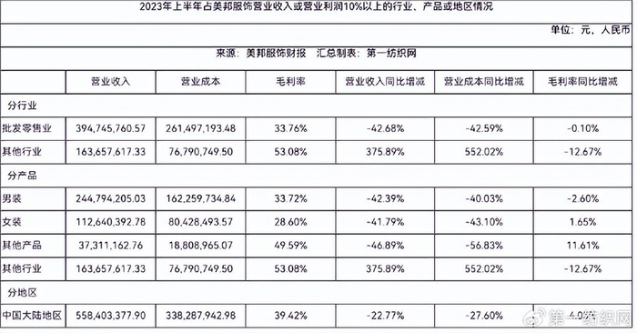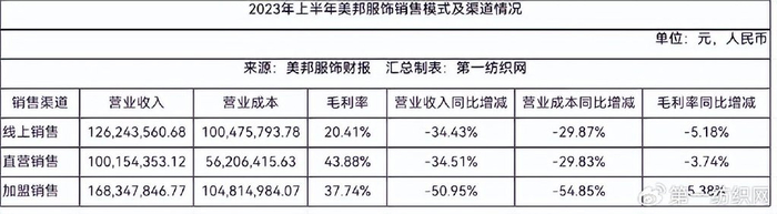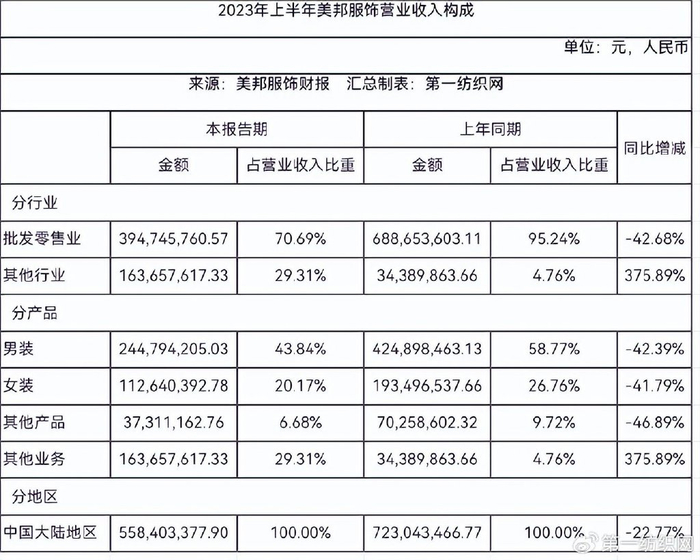 第一纺织网据财报获悉,进入2023年以来,美邦服饰经营状况有所好转,2023年上半年,公司实现营业收入约5.58亿元,同比减少22.77%;归属于上市公司股东的净利润约1026万元,同比扭亏为盈;2023年前三季度,美邦服饰营收约8.37亿元,同比减少13.49%;归属于上市公司股东的净利润约4164万元,同比增加105.48%。