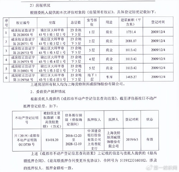本次交易标的为美邦服饰所持有的位于四川省成都市锦江区大科甲巷43号店铺,其中四川省成都市锦江区大科甲巷43号1栋-1层1号,建筑面积为1405.27平方米;锦江区大科甲巷43号1栋1层1号,建筑面积为1731.4平方米;锦江区大科甲巷43号1栋2层1号,建筑面积为2081.87平方米;锦江区大科甲巷43号1栋3层1号,建筑面积为1813.42平方米;锦江区大科甲巷43号1栋4层1号,建筑面积为1813.42平方米;锦江区大科甲巷43号1栋5层1号,建筑面积为1813.42平方米,总建筑面积为10658.8平方米。