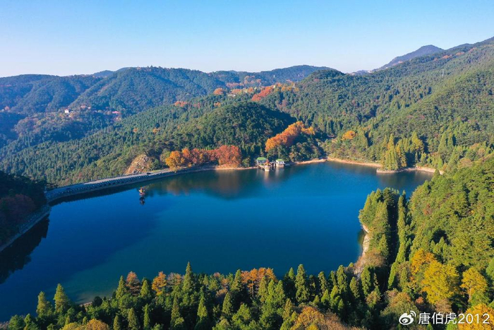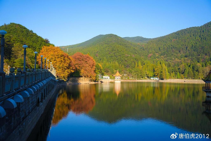 来庐山旅游第一个景点不能错过的是芦林湖,秋天的芦林湖真的很美。从黄龙寺沿石阶曲径上行约20分钟,便到芦林大桥。一路密林蔽日,树干高耸挺拔,芦林大桥高30米,桥坝一体,拦水成湖,湖水如镜,似发光的碧玉镶嵌在林荫秀谷之中。庐山芦林湖畔落叶阔叶林、针阔叶混交林等地带性植被,呈现出橙黄渐染的色彩,凌波飞虹的芦林大桥、路旁鹅黄的梧桐树,与波光粼粼的芦林湖、赏景拍照的游客构成一幅秋韵浓郁的绝美山水画。