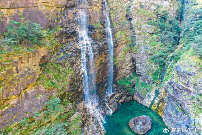 古人称“匡庐瀑布,首推三叠”。三叠泉瀑布风姿秀美,三叠各不相同,别有一番韵味。整个瀑布从上到下像一条洁白无瑕的水幕从天空飘落,随风飘舞。周围山峰叠翠,奇石嶙峋。潺潺流水声如同优美的旋律在山谷间荡漾回旋。瀑布跌落形成一个水潭,池水清可见底,颜色就像迷人的绿宝石。