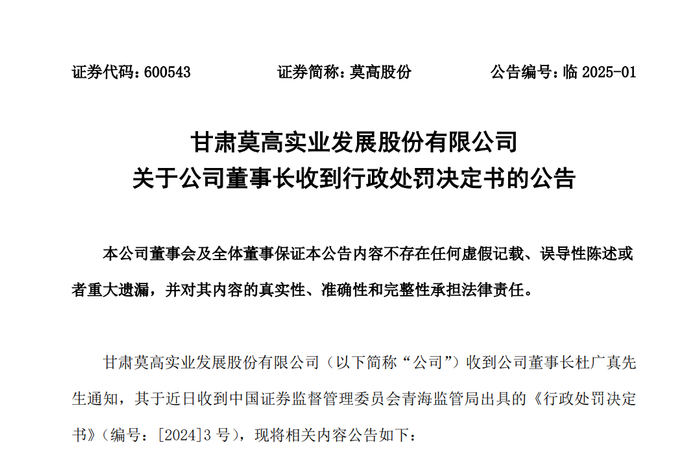 日前,莫高股份官方披露,公司董事长杜广真因内幕交易收到青海证监局出具的《行政处罚决定书》。