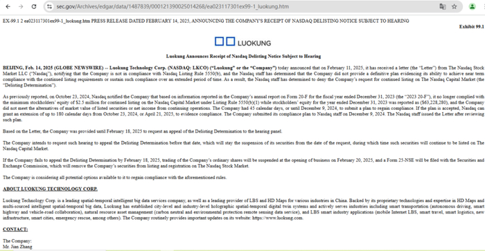 随后,纳斯达克工作人员对该计划进行审慎评估,向箩筐技术发出了信函:公司必须在2025年2月18日之前,向听证小组就退市裁定提出上诉。