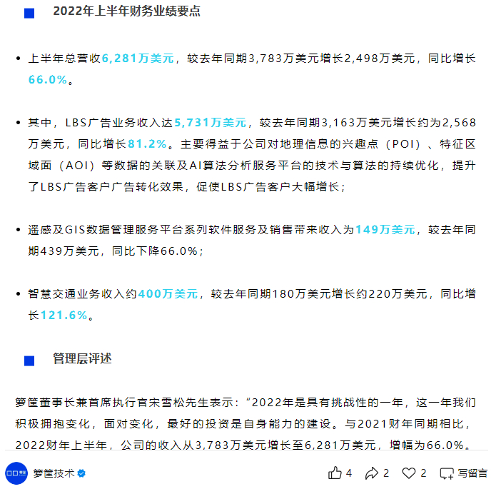 截至发稿,箩筐技术官微的财报数据停留至2022年上半年。2022年12月,箩筐技术称2022年上半年总营收6281万美元,较去年同期3783万美元增长2498万美元,同比增长66.0%。其中,LBS广告业务收入达5731万美元,较去年同期3163万美元增长约为2568万美元,同比增长81.2%;遥感及GIS数据管理服务平台系列软件服务及销售带来收入为149万美元,较去年同期439万美元,同比下降66.0%;智慧交通业务收入约400万美元,较去年同期180万美元增长约220万美元,同比增长121.6%。