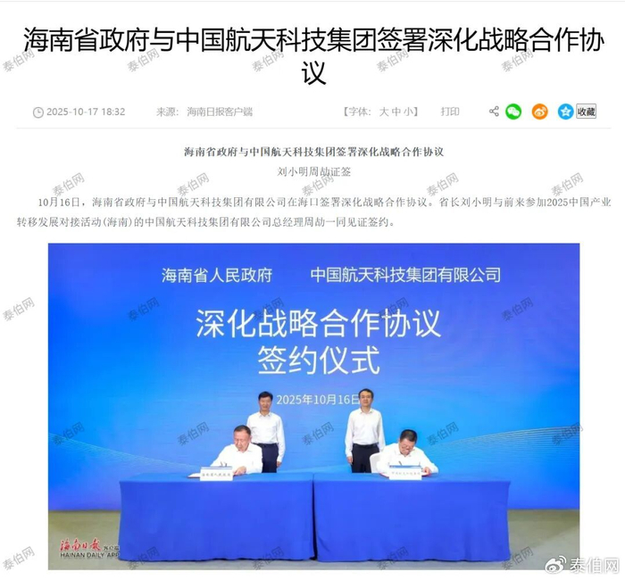 今年10月,海南省政府与中国航天科技集团签署深化战略合作协议。根据协议,双方将充分发挥各自优势,以海南商业航天发射场为牵引,依托文昌国际航天城,共同发展航天高科技产业。为推进航天强国、海南自由贸易港战略实施提供有力支撑。