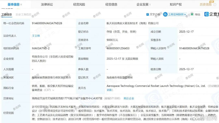 企查查平台信息显示,海南商火注册资本9000万元,法定代表人为王立扬,于文凯任总经理,由中国航天科技集团旗下“中国航天科技集团商业火箭有限公司”全资持股,注册地位于海南省文昌市航天城。