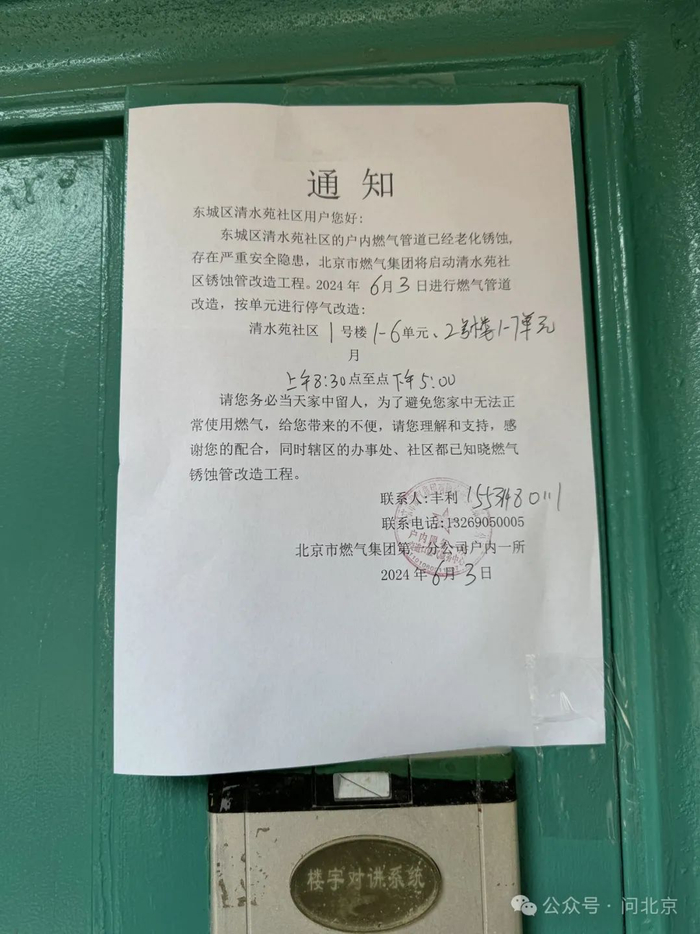 清水苑社区甲6号院位于东城区东直门街道,今年6月,小区部分楼栋开始进行燃气管道外移改造。居民说,6月2日社区工作人员在居民群中发布了改造《通知》,《通知》显示,北京市燃气集团将启动清水苑社区锈蚀管改造工程,6月3日按单元进行停气改造。居民王女士(化姓)向“问北京”(北京新闻广播新闻热线65159063)反映,小区燃气改造没有征求居民的意见,突然接到通知让大家不知所措。