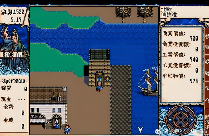 《大航海时代 1》的画面现在看就是 “马赛克开会”,船像漂在海上的火柴盒,港口城市全靠文字描述,但就这么个 “简陋” 的游戏,藏着无数勾人的设计:你可以选葡萄牙、西班牙、英国等国家,从里斯本出发,拉着羊毛去北非卖,赚了钱换大船,然后去探索未知海域。最刺激的是碰到海盗,你得手动调整船帆角度,用有限的火炮轰他们 —— 虽然操作像打太极拳,但第一次赚到 10 万金币时,那种成就感比现在抽中 SSR 还爽!