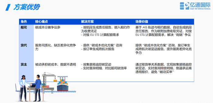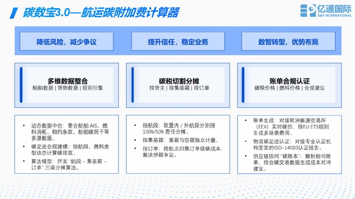 亿通国际将整合船舶AIS、燃料消耗、租约条款、船舶碳因子等多源数据 ,开展碳足迹合规建模,从宏观航段到微观订单,层层拆解碳排放责任,让碳附加费的分摊有理有据,从根源上减少争议,降低因数据不清、责任不明带来的合规风险。