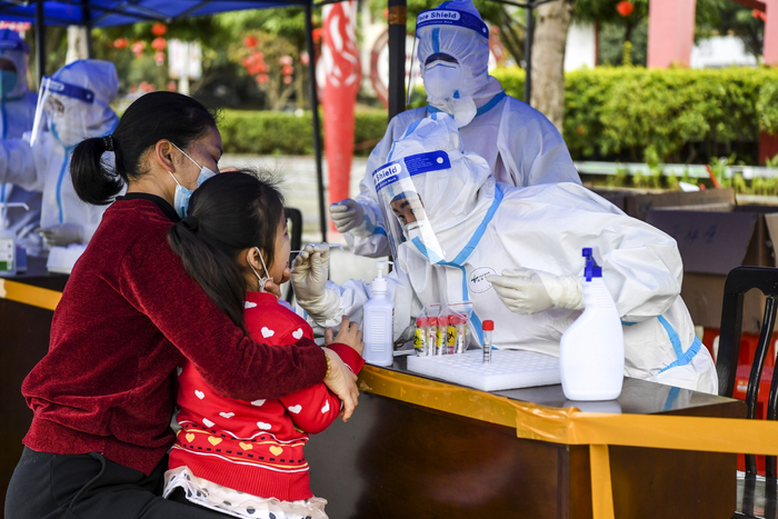 2月16日,在广西百色市德保县,医务人员在做核酸采样。目前,百色疫情社区传播链基本阻断,社会面基本实现清零。(新华社记者 曹祎铭 摄)