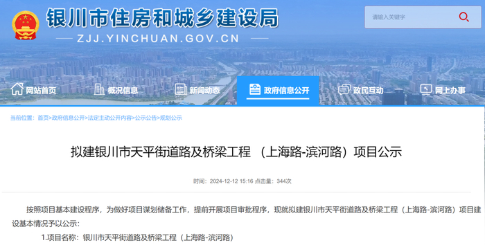 按照项目基本建设程序,为做好项目谋划储备工作,提前开展项目审批程序,现就拟建银川市天平街道路及桥梁工程(上海路-滨河路)项目建设基本情况予以公示: