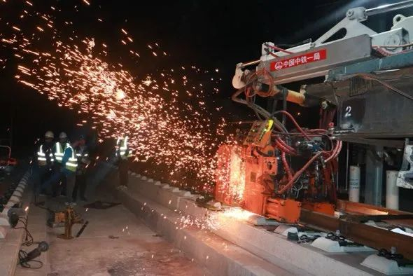 现场经过中铁一局施工人员对长钢轨焊接头进行除锈、焊接、正火、打磨和探伤等一系列复杂工序后,一根根500米长钢轨经过单元焊接变为1.5公里的单元轨,再经过锁定焊及应力放散施工变成无缝线路,不断向前延伸。