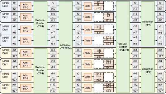 该策略精准匹配模型结构和硬件互联拓扑特性:Attention模块采用DP2+TP4并行方案,轻量参数聚焦单CPU内高效通信;Expert模块针对路由专家的分组与动态负载,采用TP2+EP4策略,实现计算均衡与效率提升;共享专家则以TP8全芯并行,加速稠密计算,全方位激发昇腾平台算力潜能。