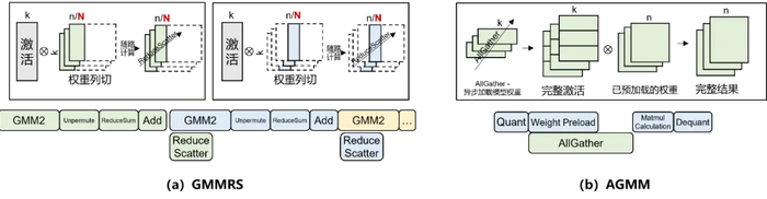 针对Pangu Pro MoE模型中Expert模块通信占比高的问题,构建GMMRS(GroupedMatmul+Reduce-Scatter)与AGMM(AllGather+Matmul)两大融合策略,有效克服通信与数据搬运和计算之间的瓶颈,实现关键通信路径的流水掩盖,进一步释放模型在昇腾平台上的推理性能。通过这套“边讨论边干活”的融合式优化机制,通信与数据搬运和计算协同推进,显著提升了模型在昇腾平台上的推理效率,最大化释放硬件资源潜能。