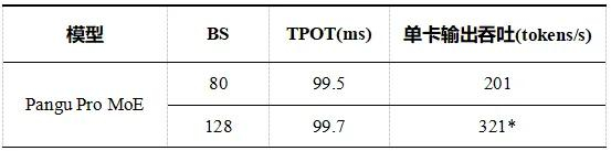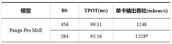 在解码阶段采用4卡部署策略,Pangu Pro MoE模型实现了卓越的推理性能:小并发场景下(BS=1,Seq=2k)权重搬运量仅16B,具备低时延响应能力;大并发场景下(BS=456,Seq=2k),单卡吞吐达1148 tokens/s,较72B和32B稠密模型分别提升97%和18%。结合MTP投机推理技术,在token接受率达0.9时,单卡BS可提升至146,平均时延降至95.56 ms,最高吞吐突破1528 tokens/s,显著提升高并发任务的推理效率。