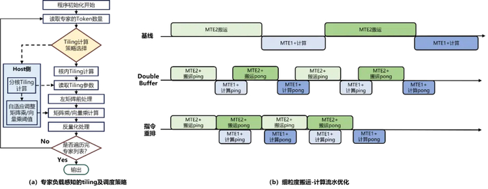 SwiftGMM引入基于历史数据的智能分块缓存策略,通过动态预测并调整最优分块参数,规避重排开销;同时根据计算负载强度,动态切换GEMV与GEMM执行模式,实现轻重计算任务的灵活调度,保障算子始终运行在高效区间。此外,该算子结合左矩阵单次加载与常驻方案以及双缓存机制,进一步实现数据搬运与计算的高效流水。通过上述系列“闪电突袭”,实现GMM计算加速2.1倍,解码阶段整网推理时延降低48.7%。