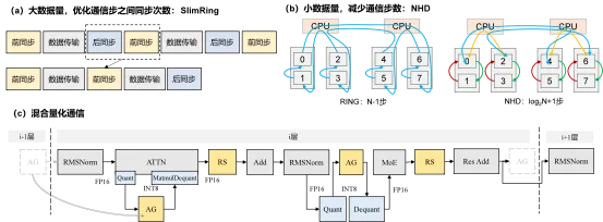 针对静态开销,提出SlimRing算法,利用Ring链路通信对象固定特性,合并相邻通信步的后同步与前同步操作,同步次数降低35%。针对传输耗时,提出NHD算法,通过拓扑亲和的分级通信等效提高链路有效带宽21%;进一步引入INT8 AllGather + FP16 Reduce-Scatter的混合量化通信策略,结合跨芯校准与量化因子复用,实现通信数据压缩25%,AllGather通信耗时降低39%。