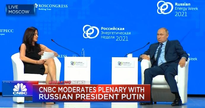 视频截图据美国消费者新闻与商业频道(CNBC)网站10月13日报道,在和CNBC主持人哈德利·甘布勒(Hadley Gamble)的对话中,普京认为大陆方面的重要讲话显示出了和平统一的可能性以及大陆“有关国家地位的态度”(philosophy of statehood),并没有军事对抗威胁。