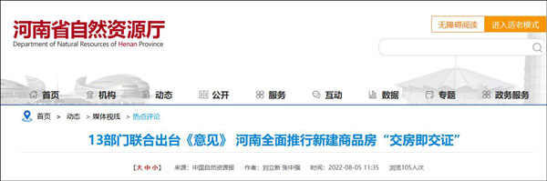 河南省自然资源厅网站5日消息,13部门联合出台《意见》,河南全面推行新建商品房“交房即交证” 。