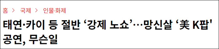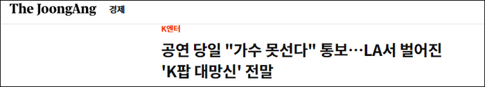 《中央日报》报道截图:演唱会当天告知“歌手缺席”…发生在洛杉矶的韩流“大丢脸”事件始末此次演唱会的演员阵容几乎有一半因为没有顺利获得演出签证未能如期出席演出。据《首尔经济》报道,原计划的15组韩国表演嘉宾里有7组未参加,其中包括少女时代组合成员金泰妍、EXO组合成员KAI、GOT 7组合里的泰国成员BamBam以及男子组合MONSTA X等韩国艺人。
