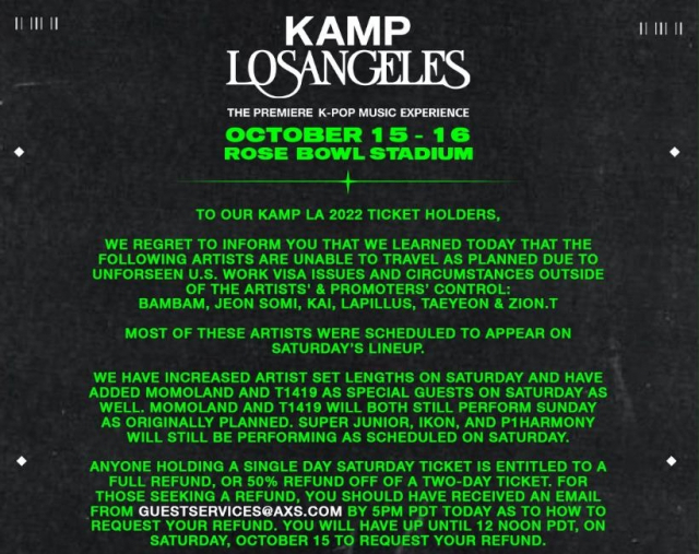 直至开演前一天,活动主办方KAMP Global才在一份声明中表示,由于不可预见的签证问题等,艺术家们不能按计划参演。不过,主办方并未详细说明相关韩星签证遭拒的具体原因。