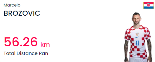 其中,“铁人”布罗佐维奇的数据惊人。与日本一役,他全场跑动16.7公里,打破了由自己在2018年创下的世界杯最长跑动纪录(16.3公里)。数据显示,他在本届赛事全部四场比赛中共跑了56.26公里,位列所有参赛球员之首。