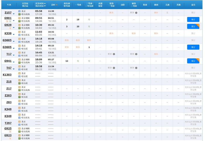 具体来看,铁路12306网站显示,北京至石家庄方向的138趟列车中,有71个车次可购票;北京至郑州方向的92趟列车中,有43个车次可购票;北京至武汉方向的48趟列车中,有21个车次可购票;但北京至哈尔滨方向的共19趟列车中,显示仅剩4个车次可购票。