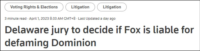 据路透社4月1日报道,美国特拉华州法院在3月31日作出裁决,驳回了福克斯新闻的辩护,认定有关多米尼恩公司“操纵选举”的报道属于“虚假信息”。预计陪审团将在两周之后审理这起案件,决定福克斯新闻是否要为相关报道做出赔偿。