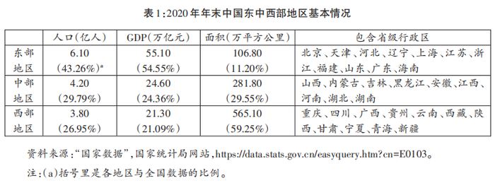 按国家统计局的划分,我国大陆区域整体上划分为三大经济地区(地带)。这三大经济地区由于自然条件与资源状况的不同有着各自的发展特点。按国家统计局对东中西部地区进行的统计,中国2020年年末的地域面积、人口和GDP分别见表1。