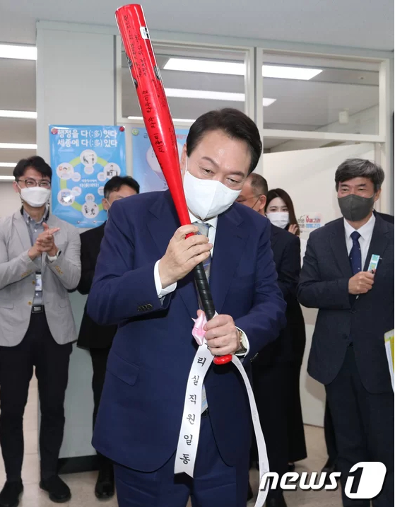 韩媒报道截图韩国国内也投其所好,去年5月,刚就任韩国总统的他在韩国重要行政机关聚集地世宗市政府大楼,接受了国政运营室职员赠送的棒球棒。