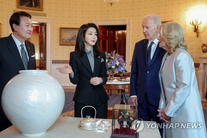 韩联社还称,在此期间,两位领导人互赠礼品。尹锡悦夫妇向拜登夫妇赠送月形白瓷罐、韩国传统女性发饰“簇头里”和银壶。拜登夫妇向尹锡悦夫妇赠送小木桌、花瓶和项链。