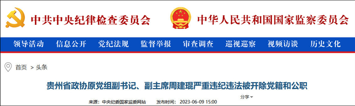 据中央纪委国家监委网站6月9日消息,经中共中央批准,中央纪委国家监委对贵州省政协原党组副书记、副主席周建琨严重违纪违法问题进行了立案审查调查。