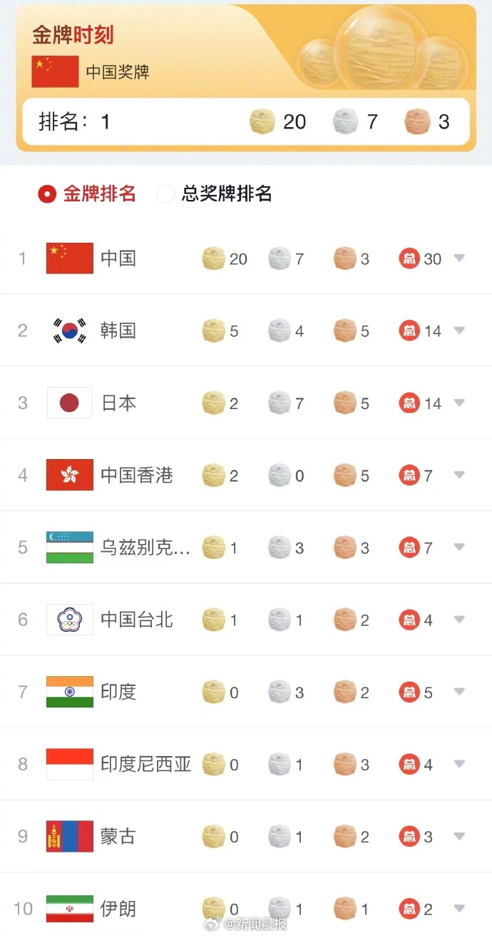 今天,亚运开幕后首个比赛日,中国队斩获20金7银3铜,共计30枚奖牌,位列奖牌榜第一名!中国游泳队今晚包揽7金,每个项目都打破了纪录。