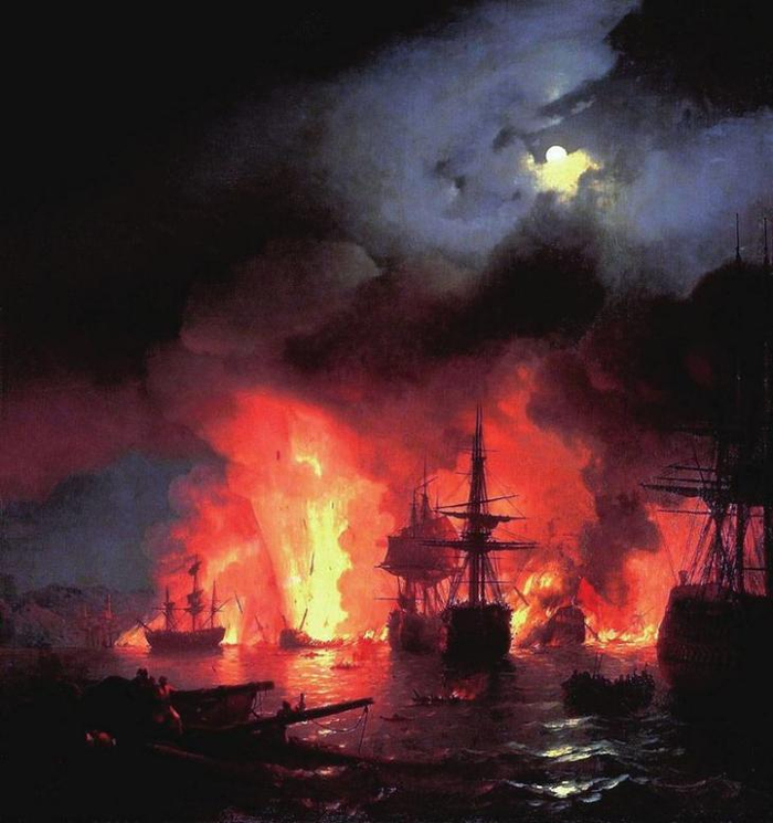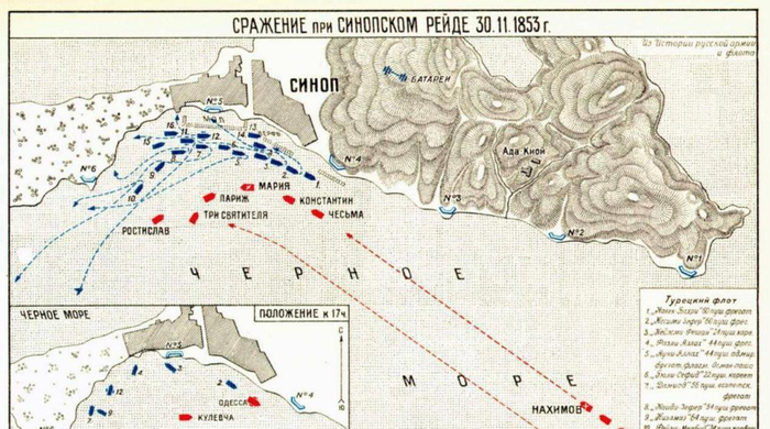 克里米亚战争巴尔干半岛方向作战经过在高加索战区,1853年11月到12月,俄军先后在阿哈尔齐赫和巴什卡德克拉尔附近挫败土军进攻。在黑海海域,1853年11月,土耳其分舰队的16艘舰艇在海军中将奥斯曼帕夏指挥下驶入锡诺普湾锚泊。11月30日晨,П.С.纳希莫夫海军中将指挥的俄国分舰队9般舰艇以双纵队突然驶入锡诺普湾,于正午时分开始炮击土耳其舰船。晚上17时许战斗结束,土耳其损失舰船15艘,死伤约3000人,奥斯曼帕夏重伤被俘;俄国数艘舰船受轻伤,伤亡240余人。