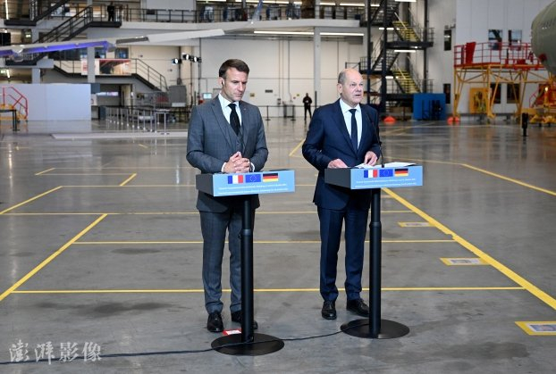 2023年10月9日,德国汉堡,法国总统马克龙访问德国,同德国总理朔尔茨参观空客工厂/澎湃影像此外,反对党德国基民盟(CDU)党主席弗里德里希·默茨(Friedrich Merz)也发出警告,若朔尔茨政府明年继续暂停执行“债务刹车”机制,基民盟可能会就此采取法律行动。