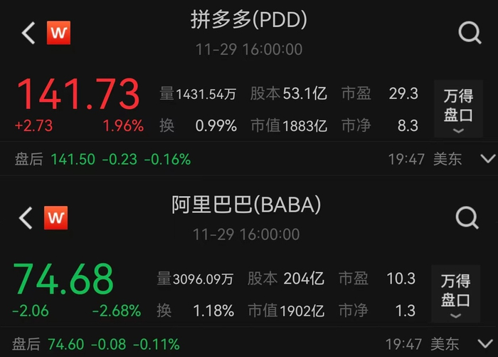 本周三(11月29日),美股开盘后不久,拼多多股价一度走高至每股144.87美元,涨幅最高达4.22%,市值一度达1920亿美元,短暂超过阿里巴巴的1915亿美元。随后拼多多股价回落,涨幅收窄。截至美股收盘,拼多多市值(1883亿美元)被阿里巴巴(1902亿美元)反超。