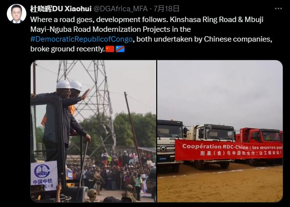 “路在哪里,发展就在哪里,”7月18日,在形容中企与刚果(金)的基建合作项目时,中国外交部非洲司司长杜晓辉在社交媒体X平台发布推文写道。